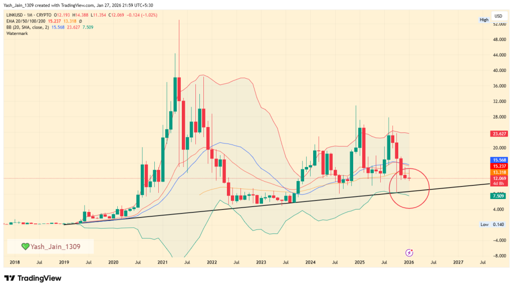 从更广泛的技术角度来看,LINK加密货币的月线结构显示,主要的上涨趋势通常只有在月线收盘K线决定性地位于其长期上升趋势线上方后才开始。而自2023年以来,这一确认尚未发生。因此,当前的下跌可能正代表了机构在更积极地重新参与市场前通常寻求的那种回调类型。