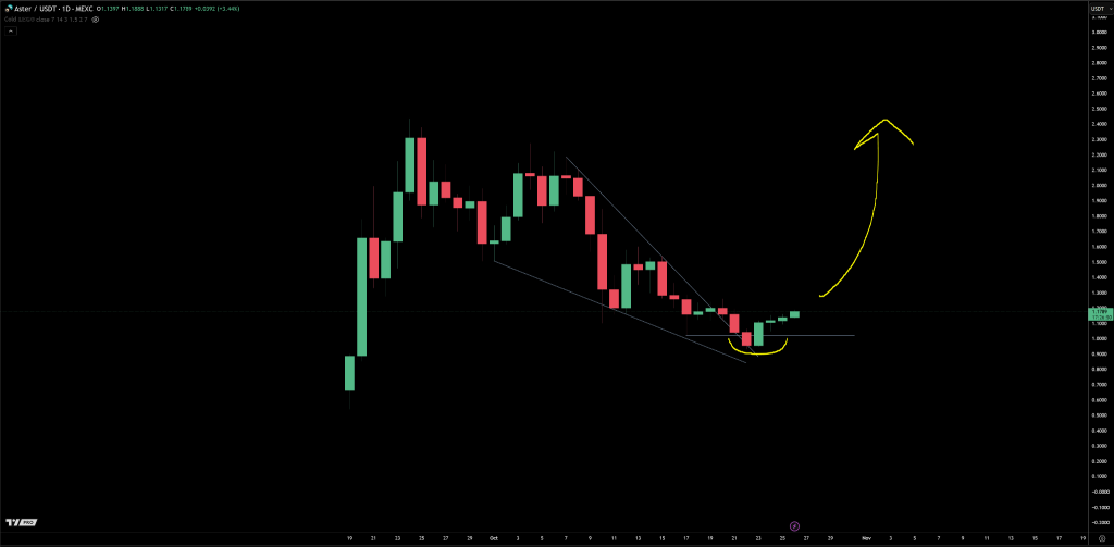 TraderSZ的日线图展示得更清晰:ASTER价格在十月大部分时间受困于下降楔形后终于突破,并在1.05-1.10美元区间形成圆弧底。该区域的反弹已连续形成多根阳线,伴随成交量逐步放大,都是资金正在积聚的积极信号。