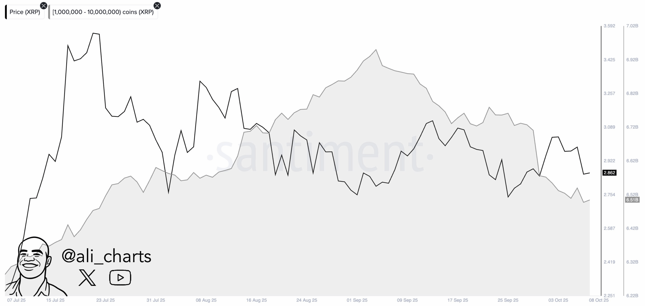 尽管如此,近期回调原因仍引发市场忧虑。比特币跌破12.3万美元导致加密市场整体降温,连带抹平山寨币涨幅。另一方面,XRP巨鲸在强劲上涨后集中抛售持仓。分析师Ali Martinez指出,最近数周巨鲸已抛售4.4亿枚XRP,这对其价值形成重压。