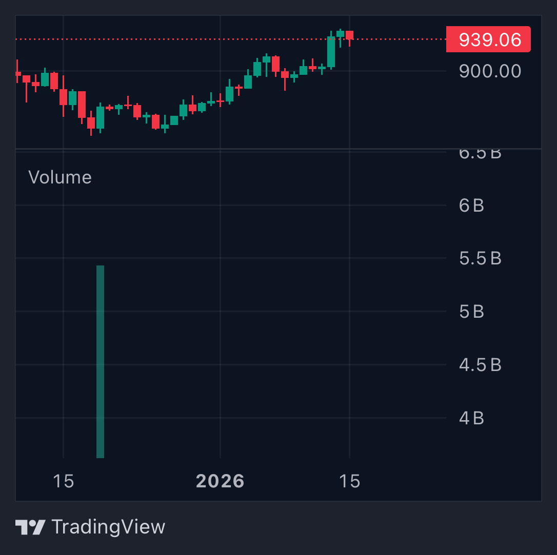 根据CoinMarketCap数据显示,在价格下跌的趋势中,BNB在过去24小时内小幅下滑0.6%,截至发稿时交易价格为939美元。
