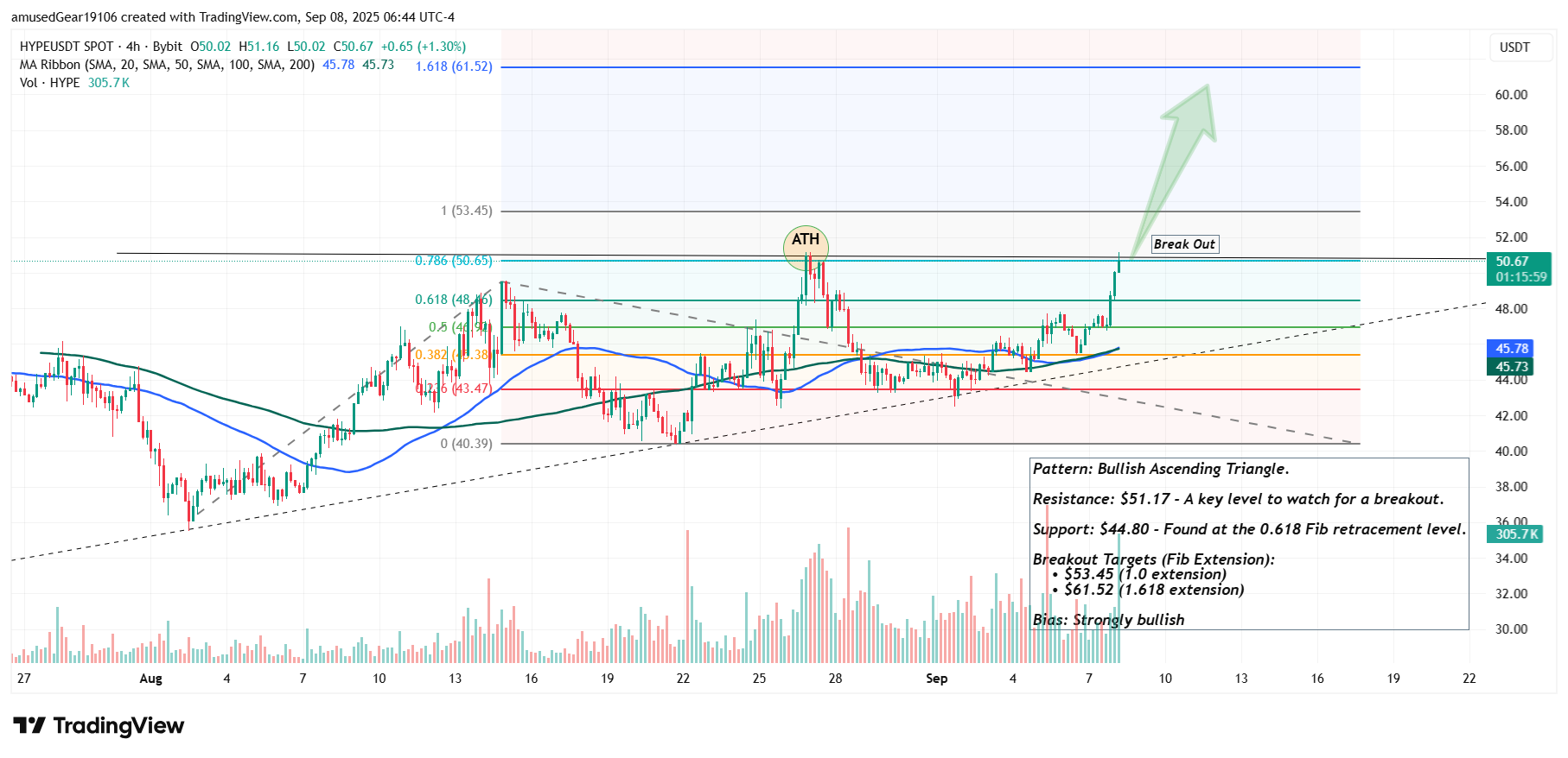 数周以来,HYPE/USD交易对始终在一个清晰的上升三角形形态内盘整——这是经典的看涨形态。该形态的水平阻力位恰好位于代币51.17美元的历史高点,同时伴随着稳步上移的支撑线。这种结构表明买家正在渐进式的高低点积极吸筹,持续挑战历史高位。