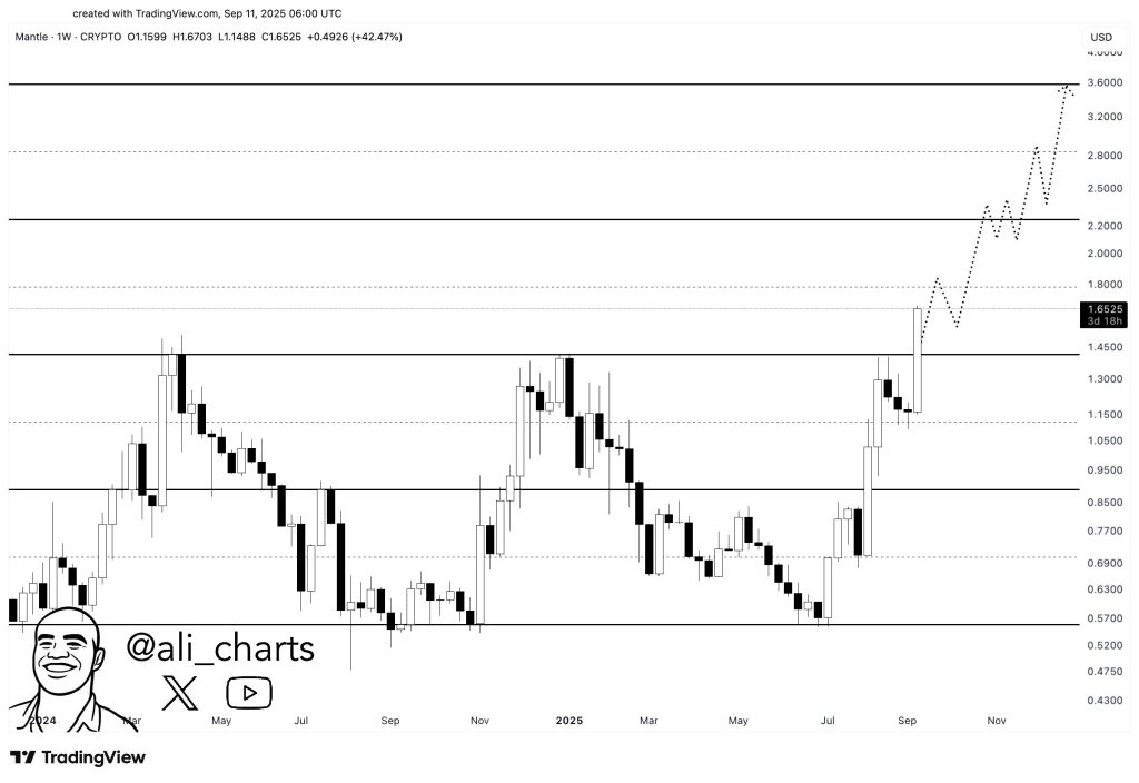 Mantle($MNT)本周迎来爆发式上涨,涨幅超过35%,成为加密市场焦点。这轮飙升源于代币突破了自2025年初以来形成的宽幅震荡通道。分析师Ali Martinez分享的周线图显示,Mantle已成功攻克1.35-1.45美元的关键阻力带——该区域在过去一年中多次压制价格。随着收盘价站稳该区间,MNT已将长期供给区转化为支撑位,为后续上涨打开空间。Martinez的图表用虚线标注了可能的上涨路径,若动能持续,价格或挑战3.60美元目标位。