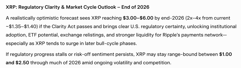 Grok AI预测,到2026年底,XRP价格可能会落在3至6美元区间。相较于当前1.35–1.40美元的水平,这将是一个显著的跃升。