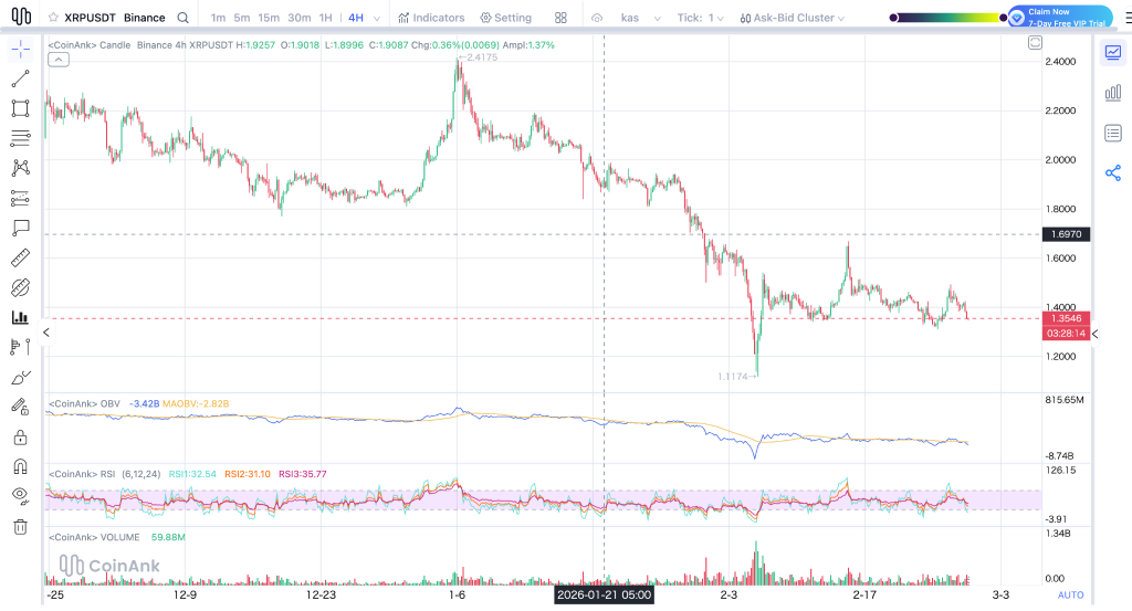 这显示看跌动能温和,但未出现恐慌性抛售。若要使XRP价格开始匹配Grok的看涨预测,它需要首先收复1.70美元,进而重回2.00美元上方。否则,XRP仍将运行在调整区间内。