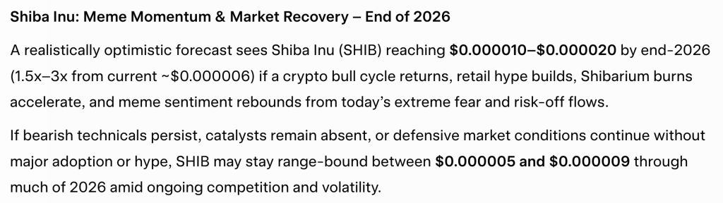 Grok AI预测,SHIB将继续下行,到2026年底可能在0.000010至0.000020美元区间内震荡,具体将取决于模因股及整个加密货币市场的总体动能。