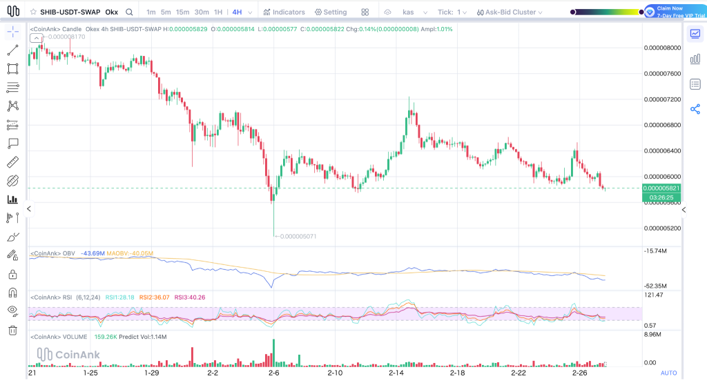 SHIB目前交易价格约为0.0000058美元,在数周内持续下跌,技术指标显示其处于强劲的下降趋势中。