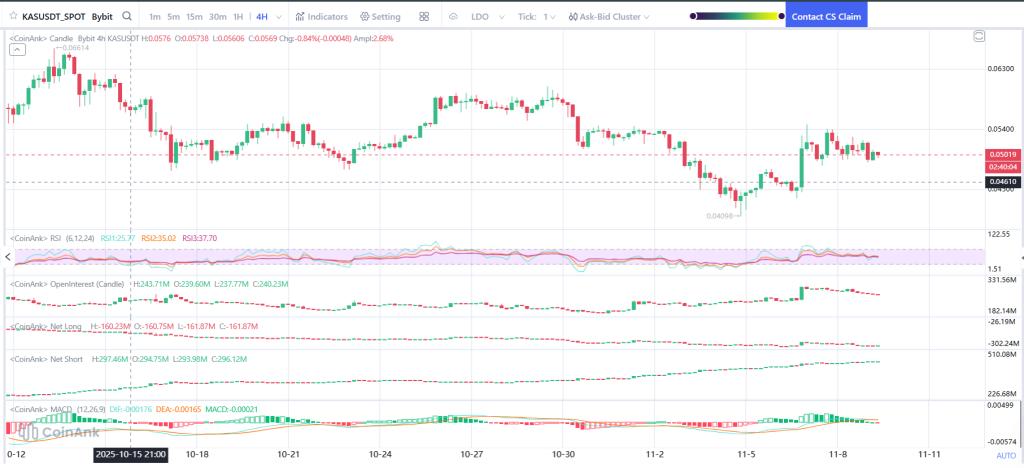 图表显示Kaspa正试图在0.046-0.047美元区间构筑底部。11月5日的抛售虽使KAS进入超卖区域,但快速回升至0.050美元帮助稳定了局势。尽管价格波动剧烈,目前仍保持稳定态势。