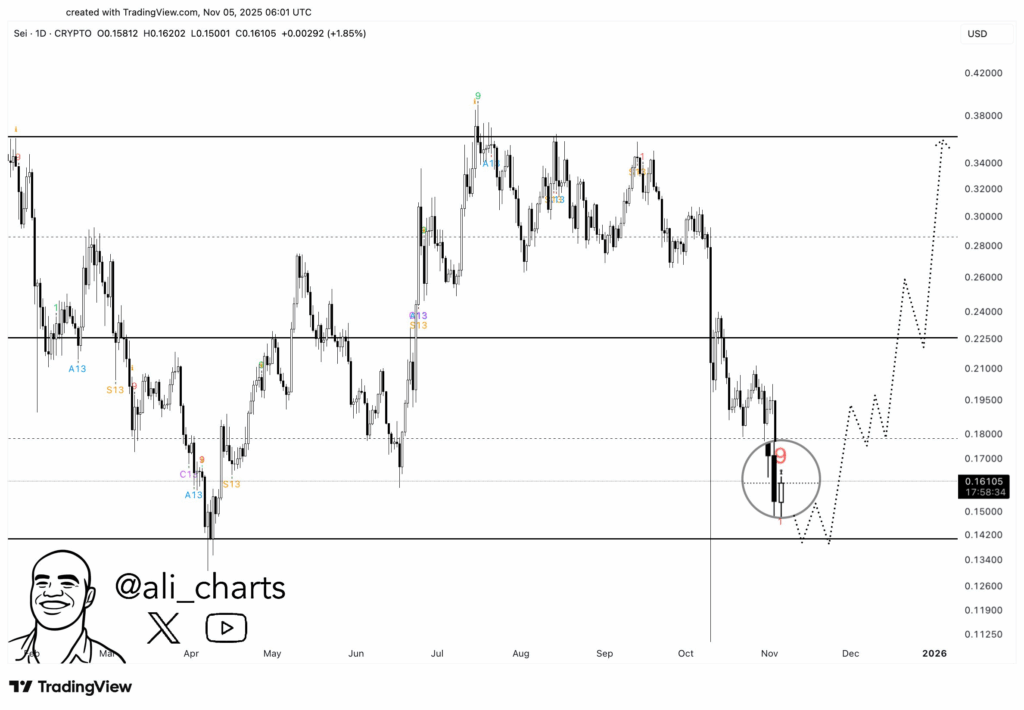 加密货币分析师阿里·马丁内斯指出,日线图表显示SEI在通道底部0.15美元附近出现买入信号,预示可能迎来重大反弹。考虑到当前加密市场整体情绪低迷,他建议投资者逢低吸纳,并给出0.23美元和0.36美元的年底价格目标。