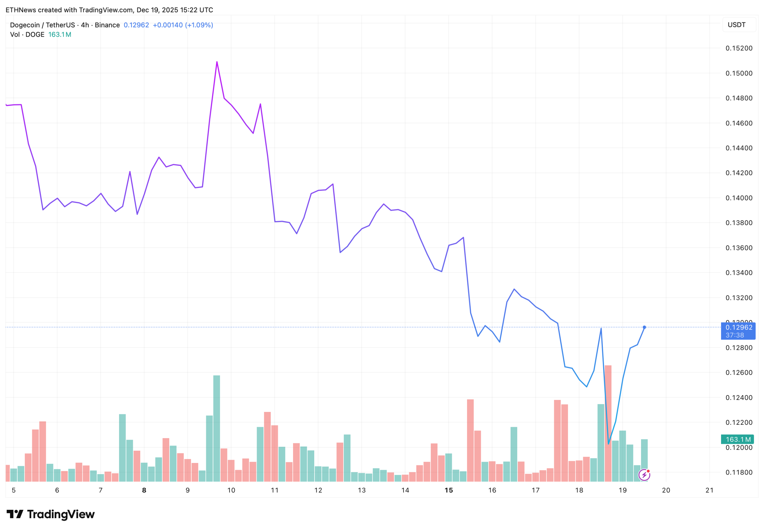 根据时间框架的不同,Dogecoin正展现出两种截然不同的技术走势。短期价格走势反映出带有不稳定反弹的修正阶段,而关注长期周期的交易者则将更长期的结构解读为潜在转折点。