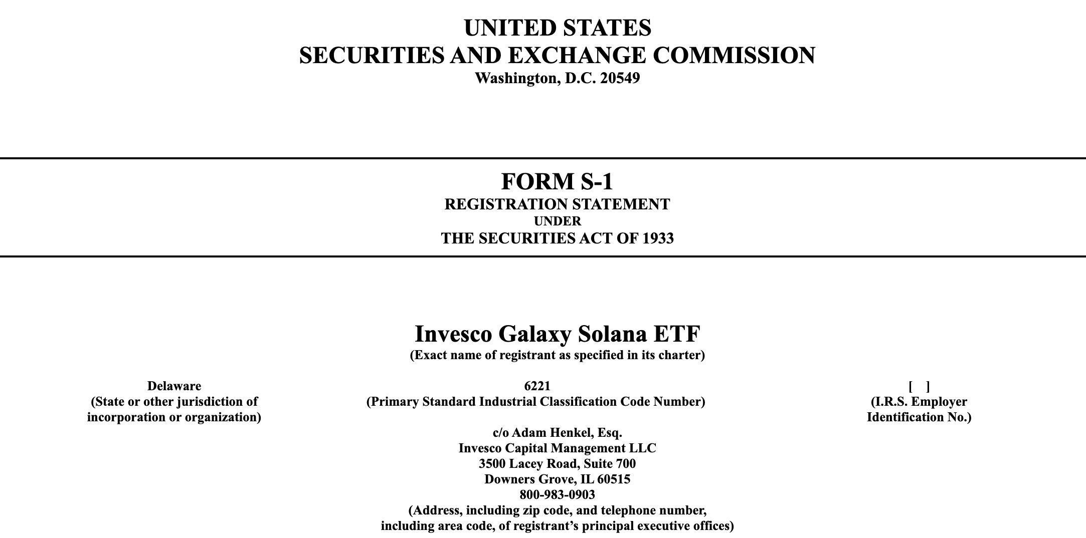 根据6月26日提交的S-1注册声明,该基金拟命名为"Invesco Galaxy Solana Trust",交易代码为QSOL,将在Cboe BZX交易所上市。基金将直接锚定市值排名第六的加密货币Solana(SOL),