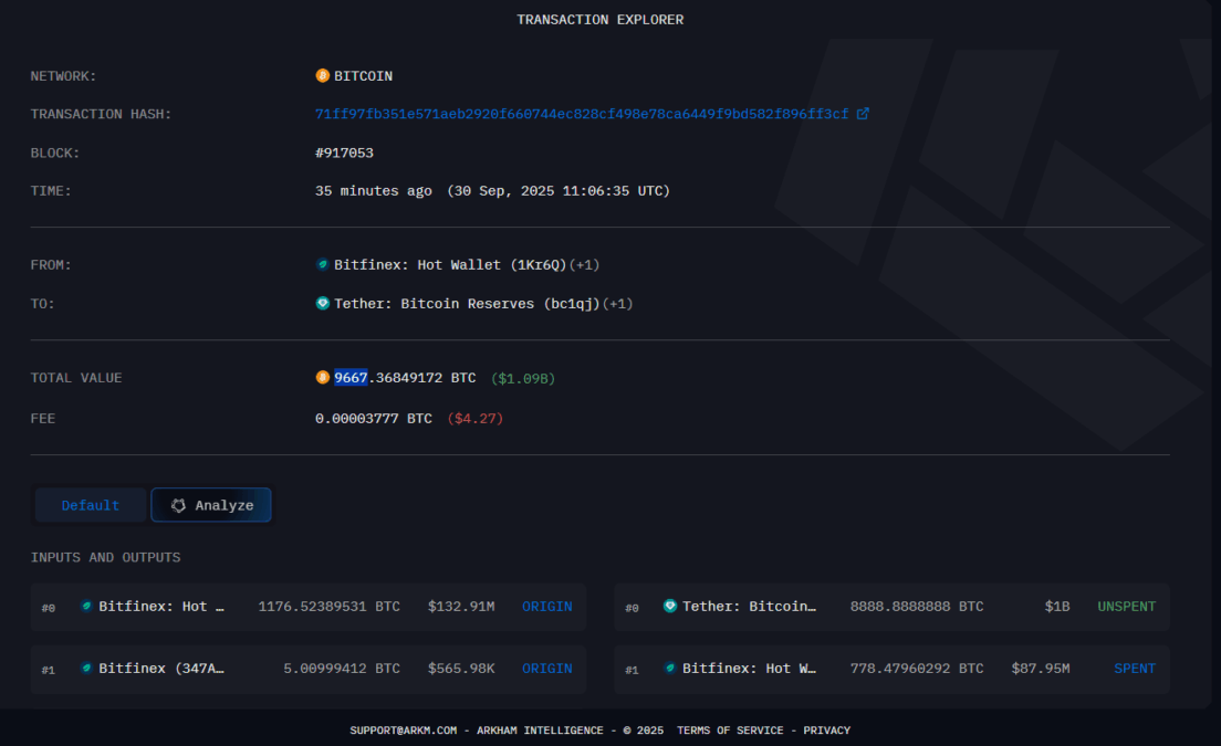 全球最大稳定币USDT发行方Tether近期大幅增持比特币,以约10亿美元购入8,888枚BTC。这笔巨额交易于今日在比特币链上完成,区块链数据显示新购代币从Bitfinex交易所钱包直接转入Tether公开披露的储备地址。
