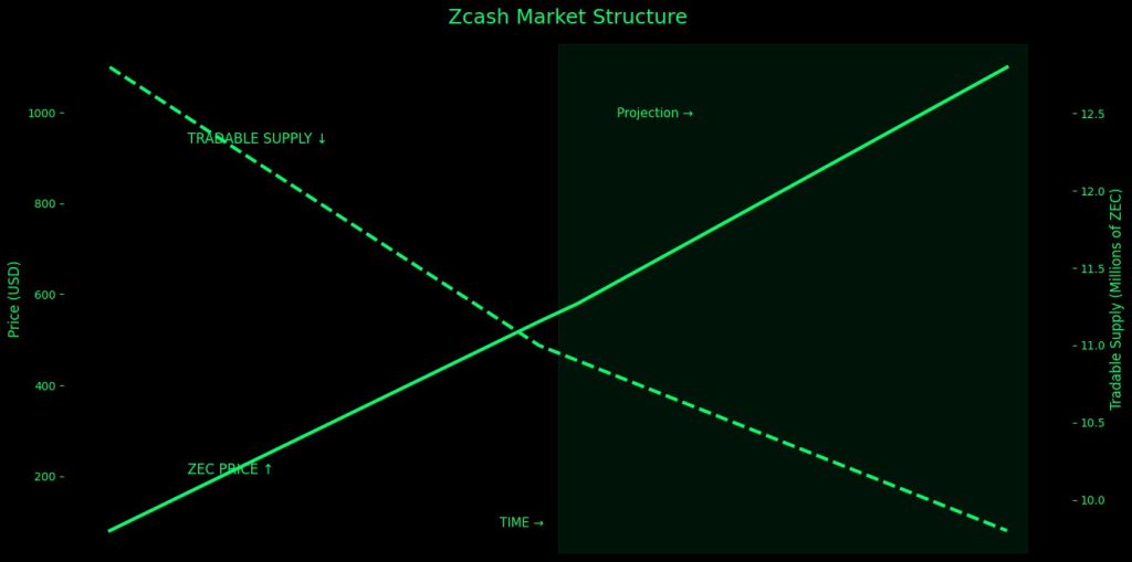 简而言之,该图表阐述了一个核心论点:当ZEC需求推高价格时,若即时可交易代币持续减少,因流动性稀薄可能导致价格波动加剧。