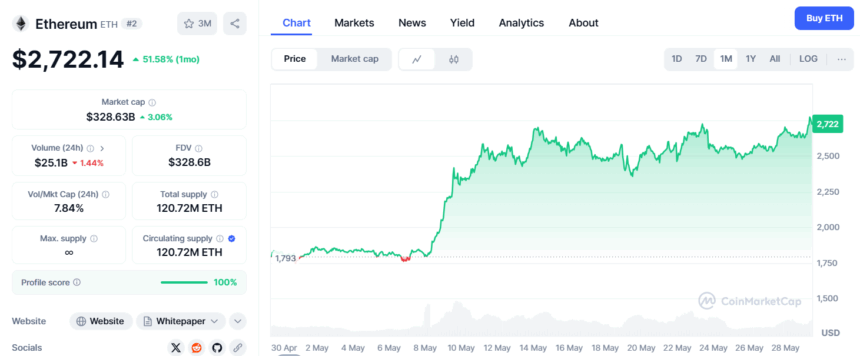 但近期市场格局出现逆转——当比特币处于下跌通道时,以太坊正蓄力突破2,800美元关口。截至发稿,以太坊交易价格接近2,722美元,24小时交易量达259.2亿美元。过去一个月其价格已飙升51%,自5月8日起加速上涨。