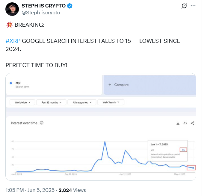 Steph Is Crypto分享的数据显示,2025年6月1日至7日期间,XRP搜索兴趣值跌至15点。这是自2024年以来的最低记录,较2024年9月100点的前峰值大幅下滑。