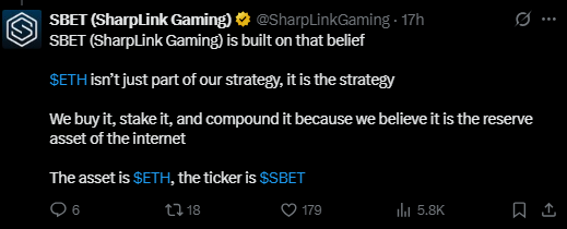 数据显示,10家配置ETH作为储备资产的企业上月累计购入超55万枚ETH。SharpLink Gaming近期单笔收购就达7.5万枚(价值2.25亿美元),如此巨量资金仅在五天内完成建仓。每周都有新机构加入ETH储备行列,且单家采购规模持续扩大。