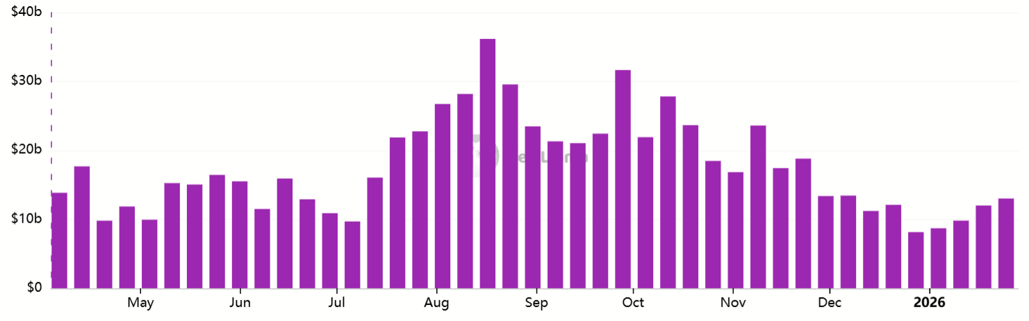 以太坊周DEX交易量达130亿美元,较四周前81.5亿美元显著增长。尽管Solana仍以300亿美元周交易量领先,但以太坊生态总量已达268亿美元。2025年12月的Fusaka升级大幅提升网络数据容量并引入交易批量处理流程,极大优化了用户体验。