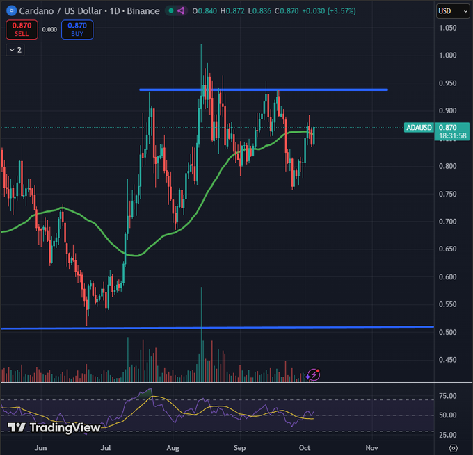 自七月中旬以来,卡尔达诺持续保持上升势头,多次测试0.90美元附近阻力位,同时稳定维持在50日均线上方。Ssebi最新市场分析显示,ADA的相对强弱指数(RSI)正接近50水平,暗示突破前可能经历短暂盘整阶段。
