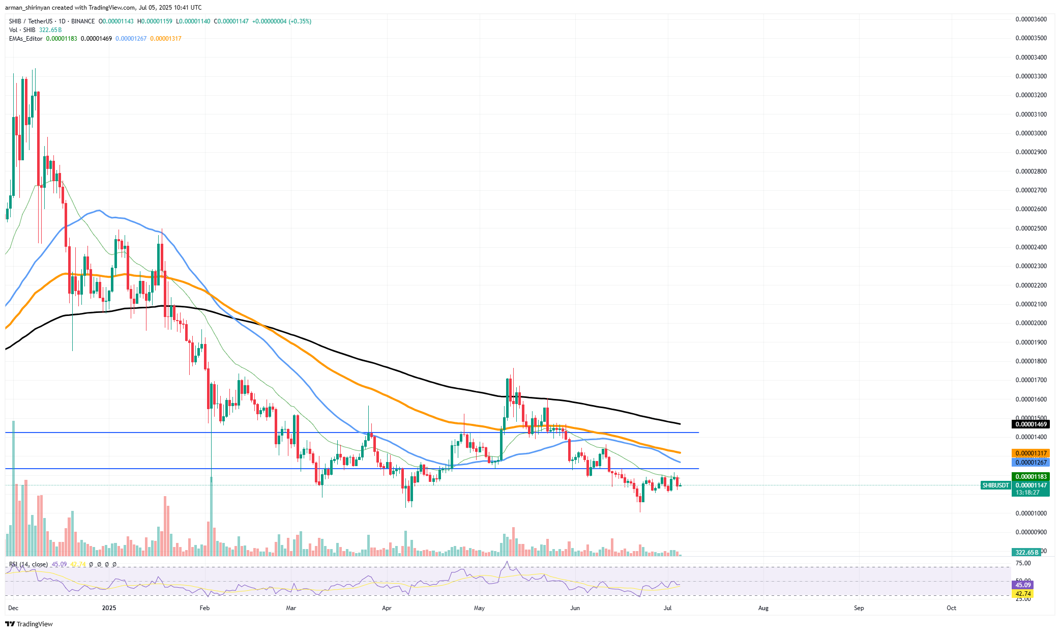 这种具备市场影响力的关键持仓方大规模积累现象表明,尽管价格停滞,柴犬币正在重新获得市场青睐。根据价格图表,SHIB已连续数周被压制在50日和100日指数移动平均线(EMA)下方,交易区间持续收窄。