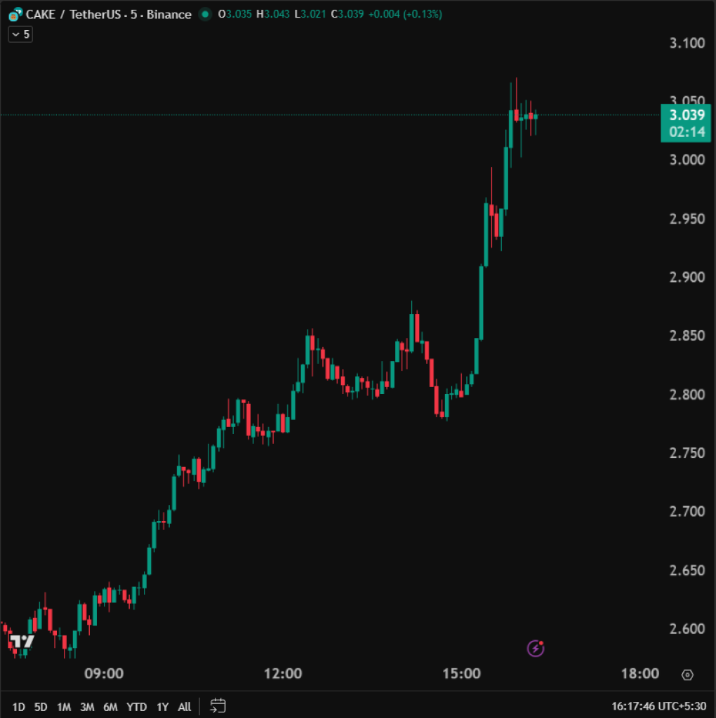 从5分钟图表可以清晰看出:每次回调都被迅速吸收。CAKE价格在短短数小时内从2.60美元附近飙升至3.00美元,形成完美的阶梯形态——更高的低点、更高的高点,且伴随强劲的交易量。