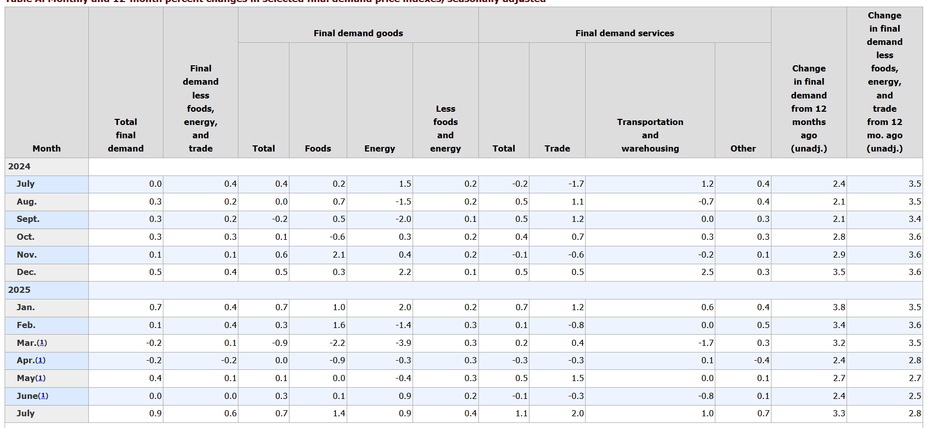 PPI报告显示,这是自2025年2月以来最大的12个月涨幅,食品、能源和贸易服务价格显著攀升。剔除这些波动项后,7月最终需求指数仍上涨0.6%,创2022年3月(0.9%)以来最大增幅。截至7月的12个月内,核心最终需求价格上涨2.8%。