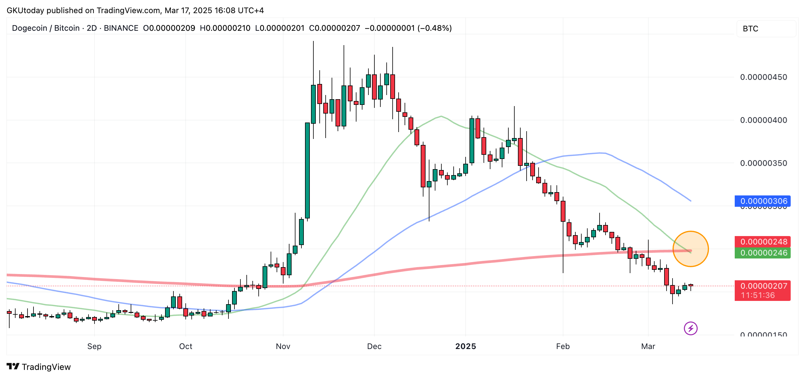 值得注意的是,这一死亡交叉发生在狗狗币对比特币(BTC)的两日时间框架图表上。虽然这种时间框架设置并不常见,但在算法交易日益盛行、机器人和人工智能在金融市场(尤其是加密货币市场)中应用越来越广泛的背景下,即使是像将时间框架调整为两日这样微小的调整,也可能提供一个鲜为人知的分析视角。