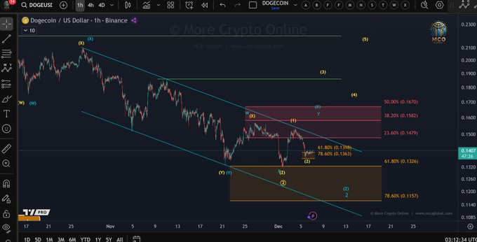More Crypto Online的最新分析指出,DOGE必须重新站上通道上轨才能维持当前看涨结构。分析中提到的黄色情景方案只要微观支撑未被有效突破就依然成立。该结构聚焦于潜在波浪演进的早期阶段,其实现前提是守住近期低点。