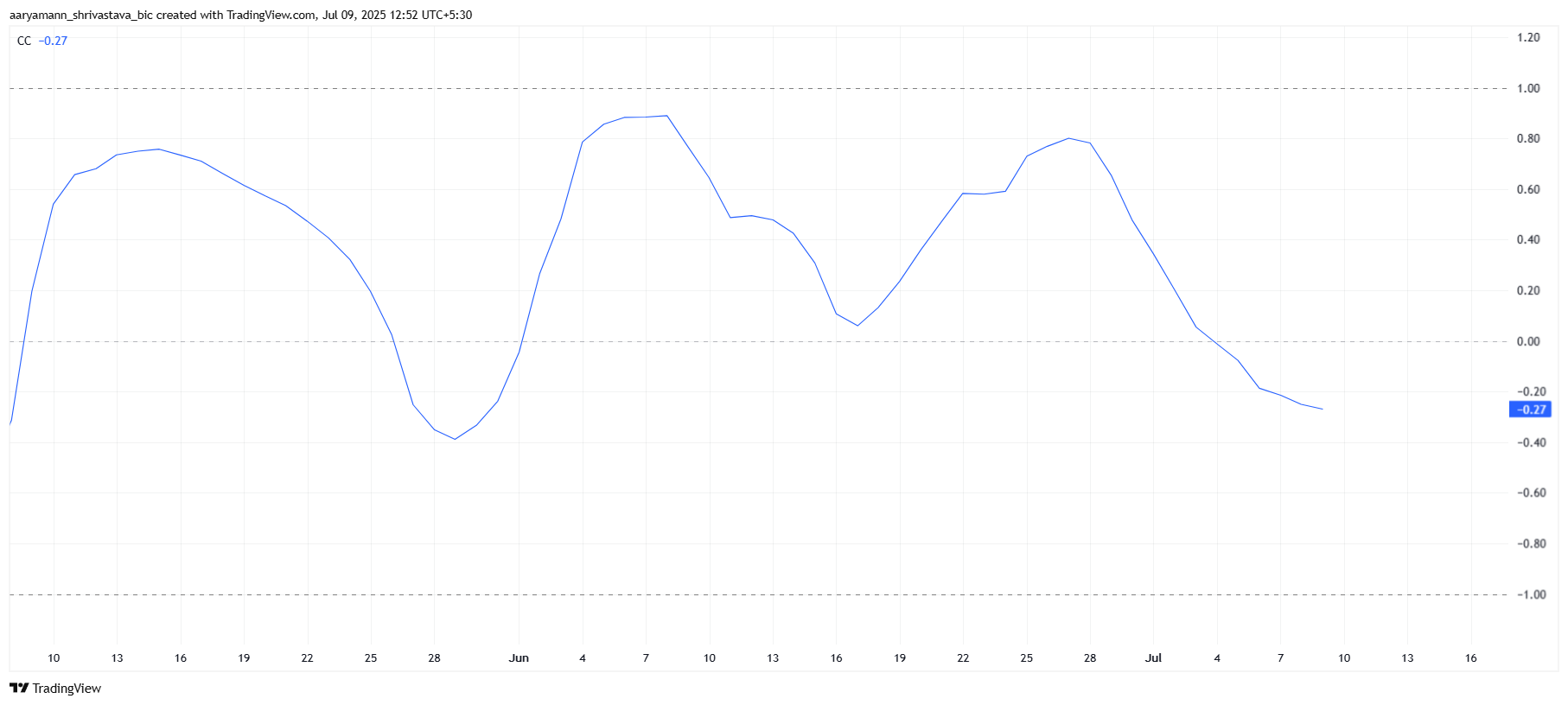 Pi币与比特币的关联度现已转为-0.27的负值,这意味着两者呈现反向波动关系。简单来说,比特币上涨时Pi币反而