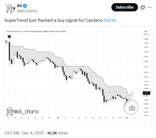 分析师阿里·马丁内斯指出,SuperTrend指标已闪现ADA买入信号,此时价格正测试0.4597美元的23.6%斐波那契位。