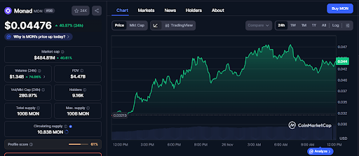 尽管遭遇攻击,MON代币的价值却出现了飙升。在第一天,MON上涨了19%,并且根据最新报告,该代币持续上涨。MON价格的飙升与该网络的公开发布时间吻合。早期代币持有者收到了他们的空投和公开销售的代币,导致交易量增加。CoinMarketCap数据显示,Monad(MON)的价格在过去24小时内上涨了40.57%。