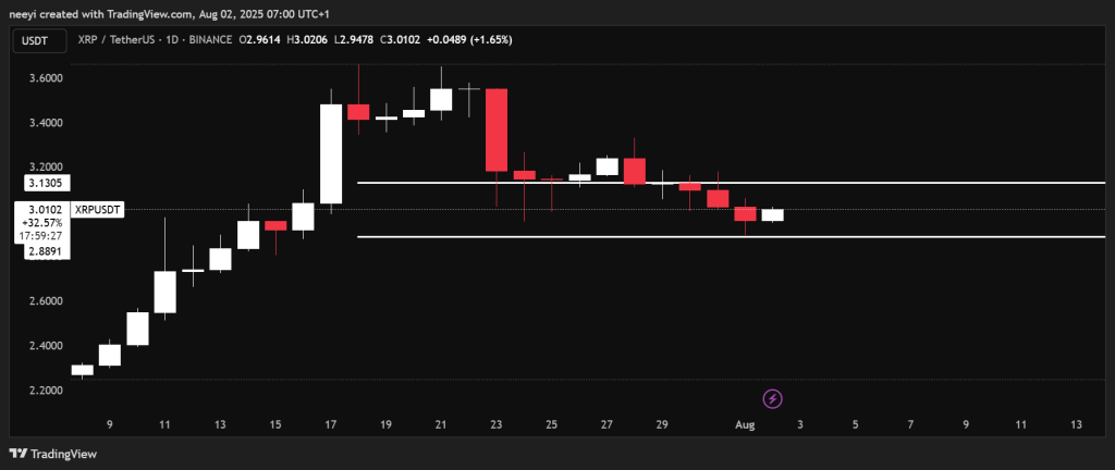 昨日瑞波币(XRP)延续下跌趋势,在触及2.89美元支撑位后小幅反弹,现报3美元附近。虽然当前呈现回升迹象,但整体下行趋势仍未改变。过去一周内,XRP累计跌幅已超15%。此次下跌始于比特币从123,000美元历史高点回落,随即引发加密货币市场整体回调。