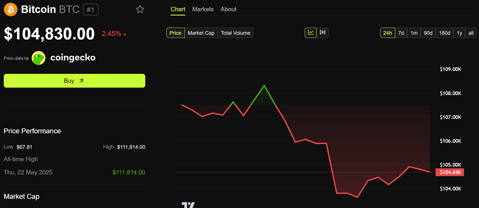 随着地缘政治紧张局势升级冲击全球市场,黄金价格飙升,而比特币(BTC)则大幅下跌。这表明投资者正涌向传统资产以对冲金融损失,引发人们对比特币避险地位的担忧。截至发稿,比特币交易价格为104,830美元,24小时内下跌近3%。