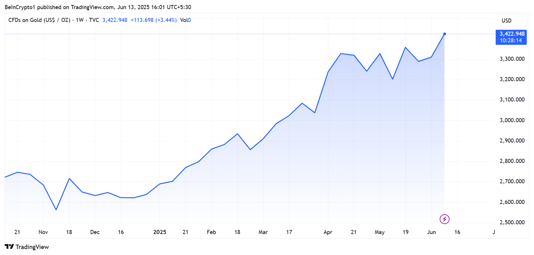 "地缘政治局势恶化导致黄金价格飙升,"股票分析师Mary表示。她强调关键支撑位为3,420美元、3,402美元和3,380美元。若突破3,440美元,则可能在美国交易时段向3,468-3,493美元区间移动。截至发稿,黄金交易价格为3,422美元。