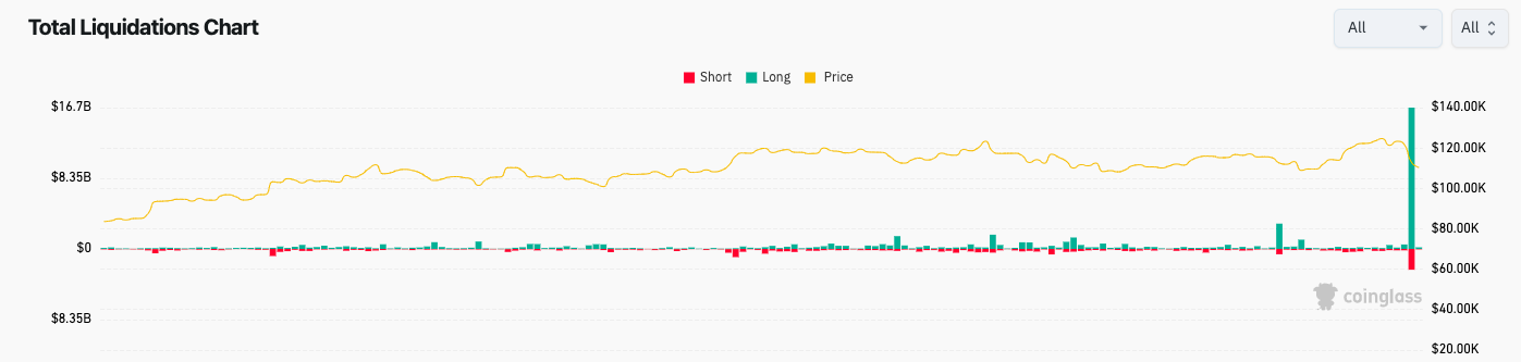 周六,比特币(BTC)在11万美元关键支撑位下方徘徊,加密货币市场正消化创纪录的200亿美元清算事件余波。这场危机突显了在市场压力激增下,近期看涨势头的脆弱性。