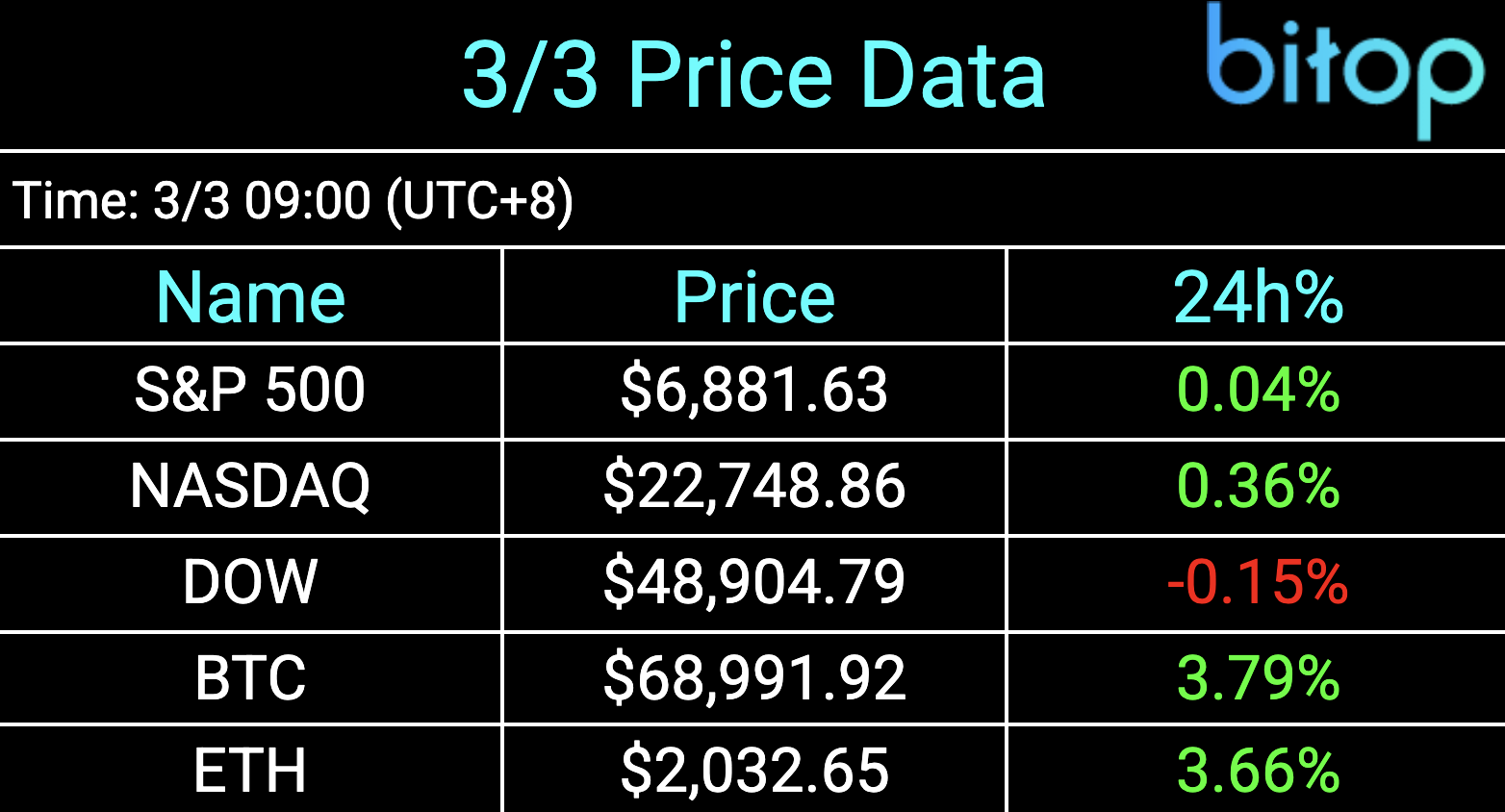 美以周末对伊朗发动空袭后,美股早盘下跌并出现大幅波动,最终收盘持平。比特币昨夜飙升至70,096美元,带动加密货币市场广泛上涨。ETF资金流入增加和买盘兴趣提供了基本面支撑,而恐惧与贪婪指数小幅回升至15。