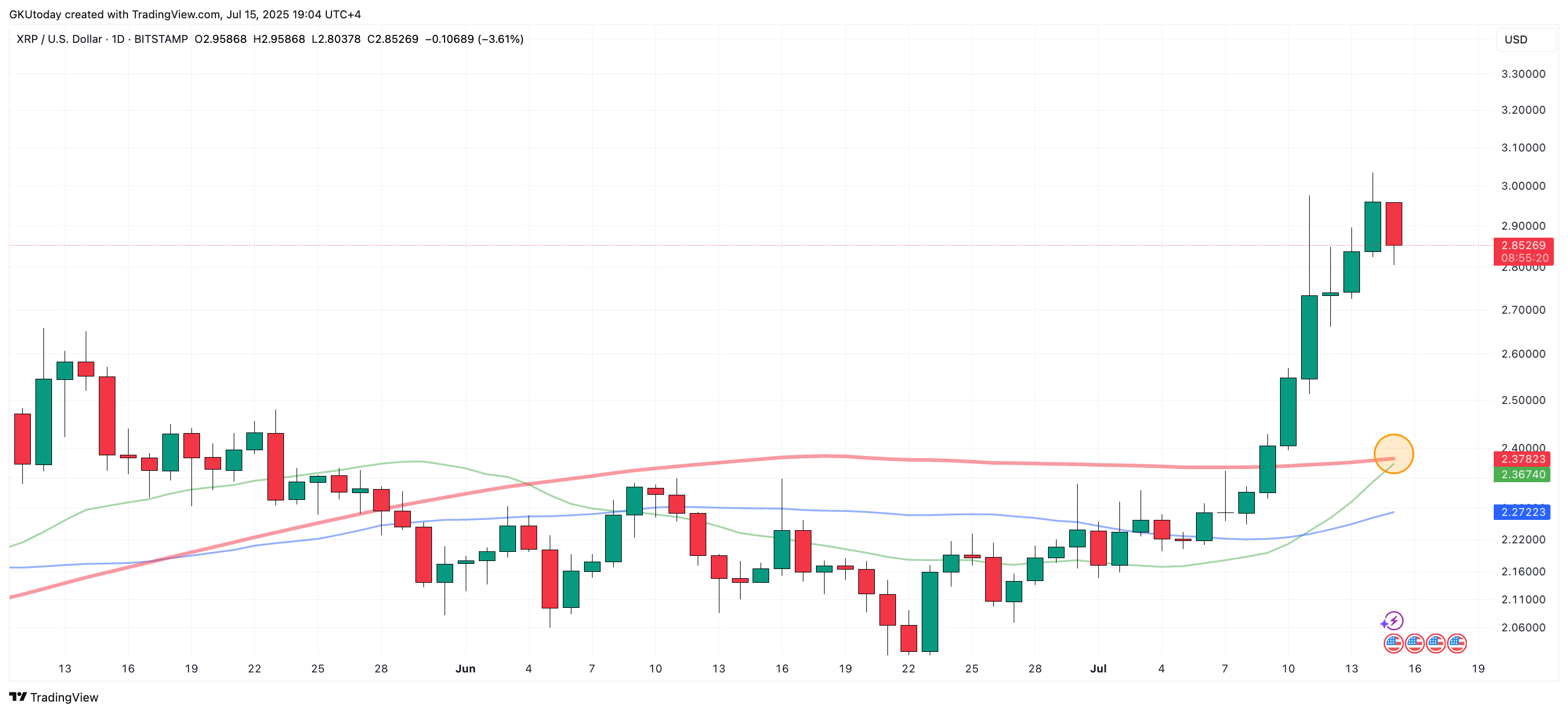 截至7月15日,XRP的23日均线即将上穿200日均线,这是数月来首次出现该信号。虽然均线尚未实际交叉,但两者距离已非常接近。一旦确认"黄金交叉"形态,将意味着趋势强度的转变,并可能为未来数周走势定下基调。
