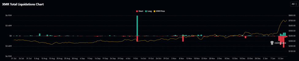 例如,XMR可能刚刚经历了近期历史上最高的日空头清算事件。周二,价值约390万美元的XMR空头头寸被清算,引发了空头挤压,进一步推动了价格创新高。
