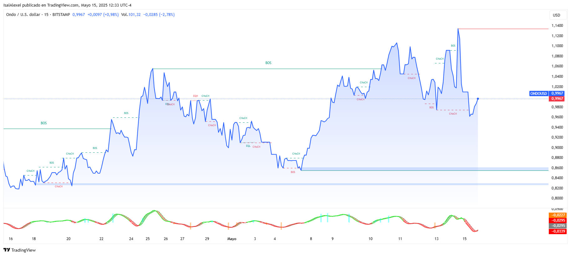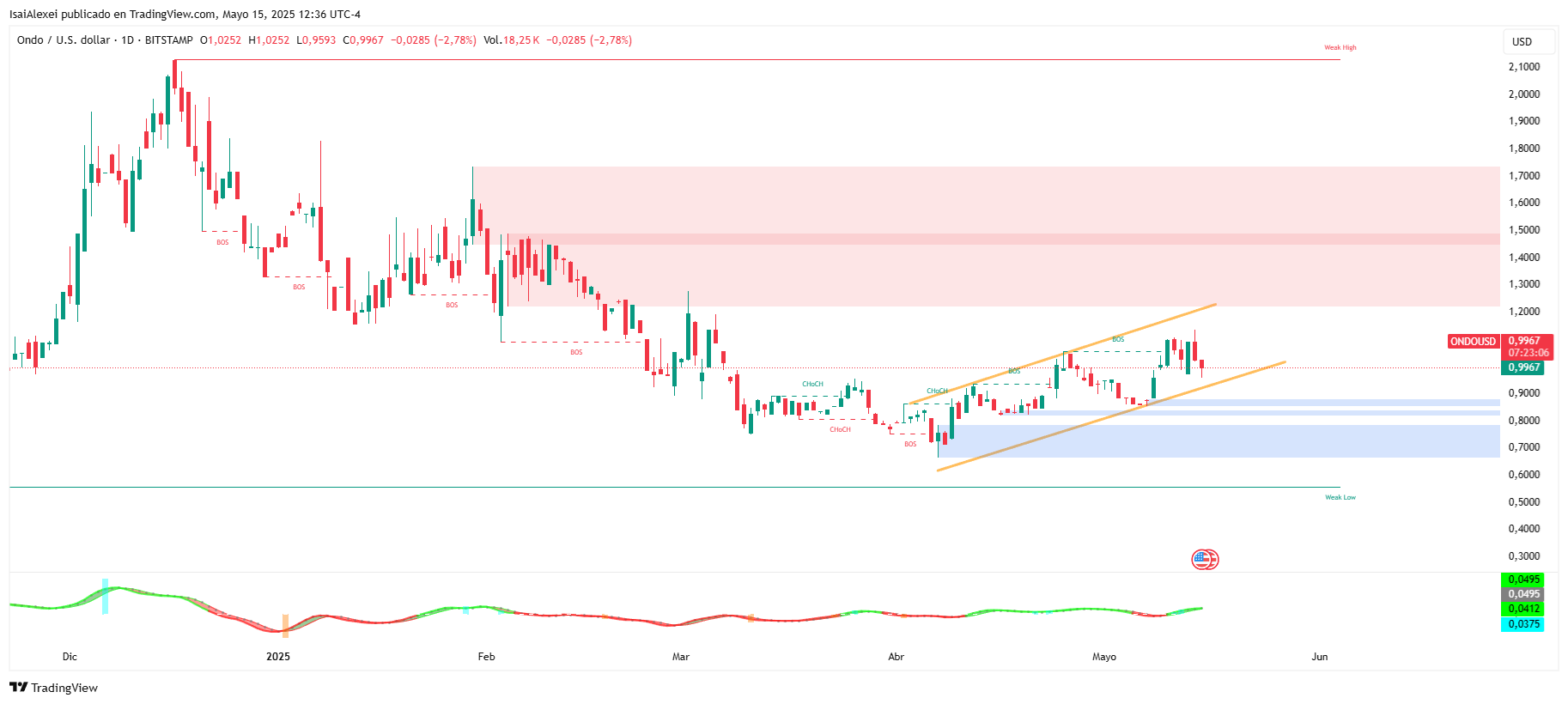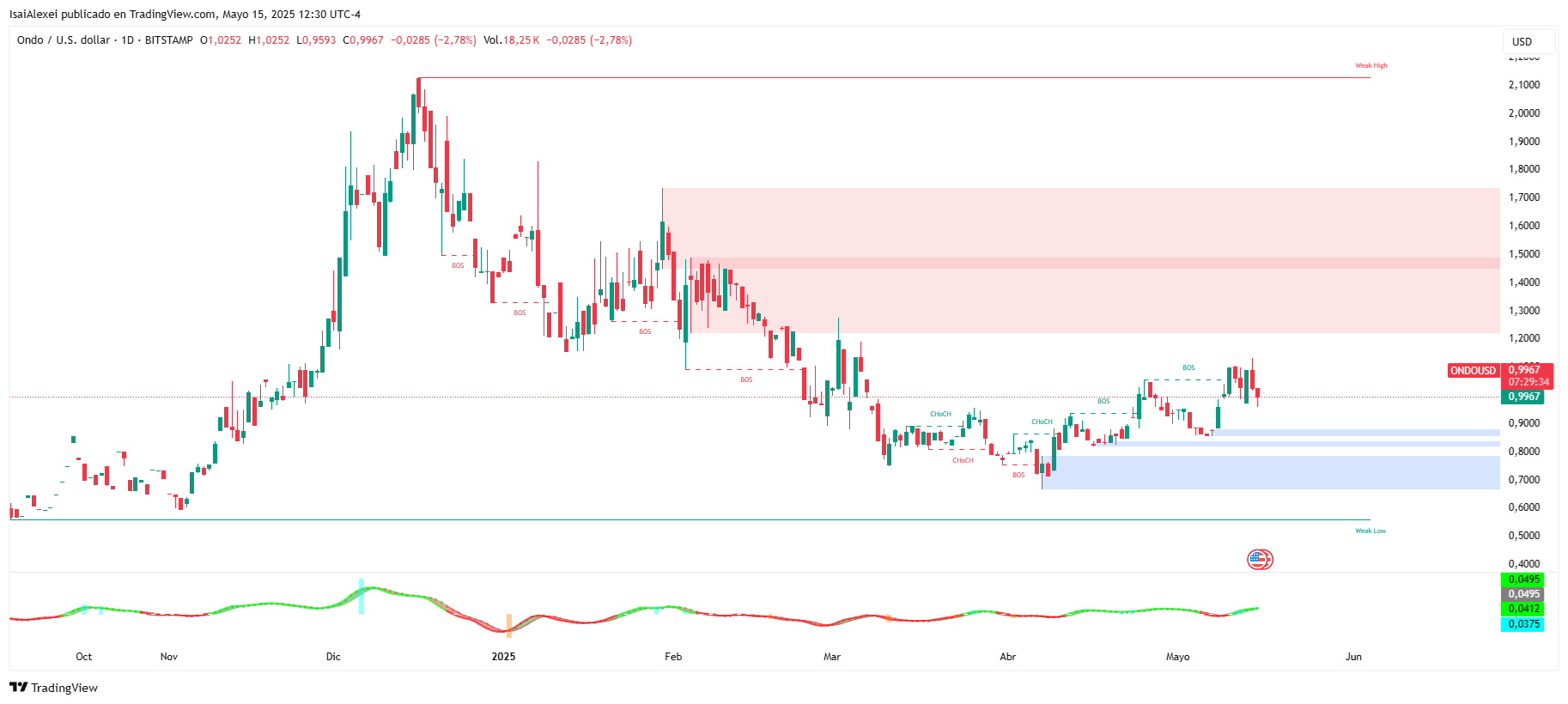 从技术上看,ONDO正在心理关口$1.00下方盘整,在$1.05阻力位遭遇拒绝。如果买家重获动能并带量收复$1.00–$1.02区间,下一个阻力位在$1.18和$1.30附近。