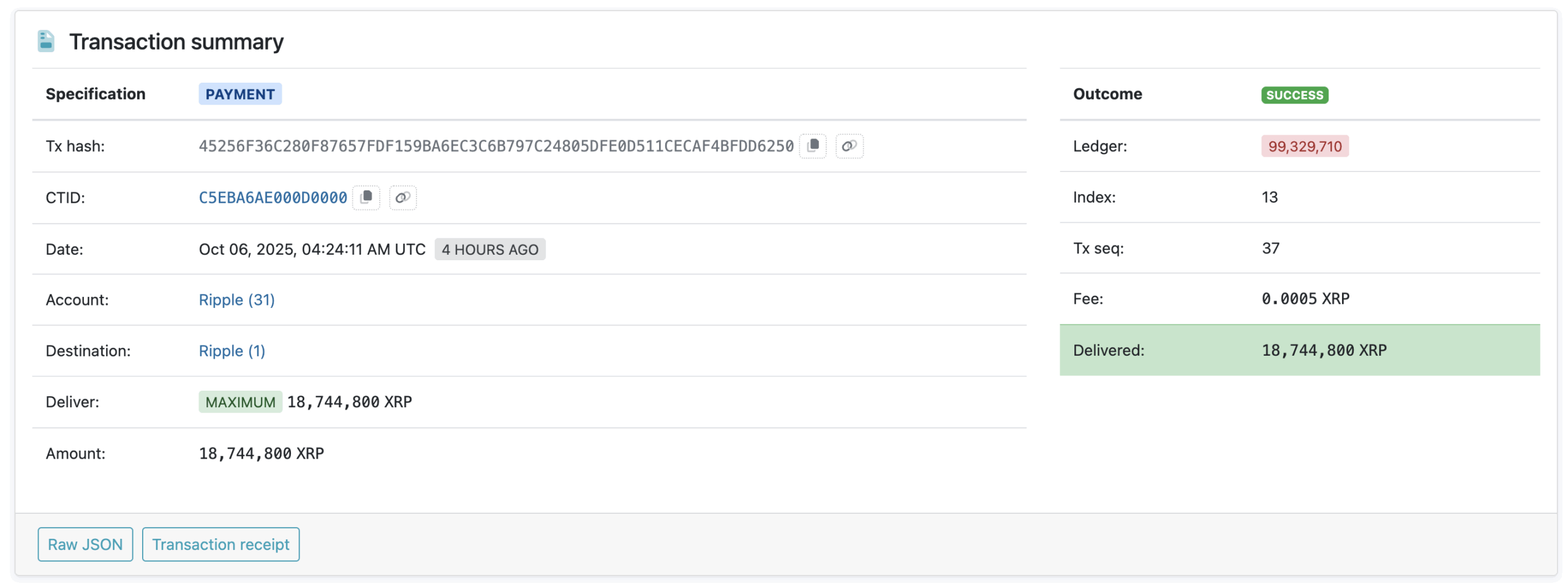 近日,一位瑞波巨鲸涉及价值5500万美元XRP的交易在加密货币社区引发热议。10月6日XRP价格跌破3美元后,Whale Alert监测到18,744,800枚XRP的转移,最初被解读为抛售信号。但区块链记录证实这是Ripple(31)向Ripple(1)钱包的内部转账