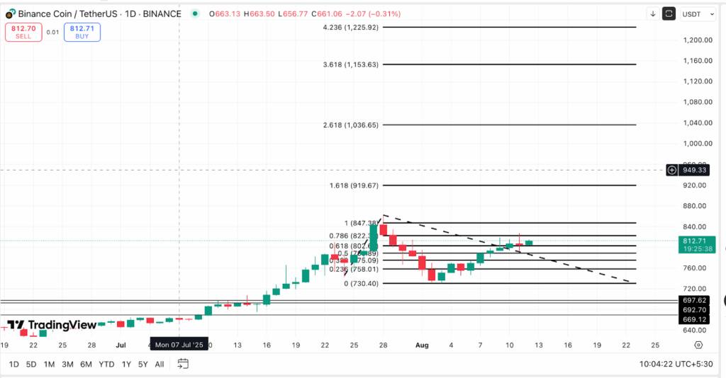 截至发稿,BNB交易于800美元附近,略低于822美元的斐波那契回撤阻力位。首个关键目标是847美元的近期波动高点。突破该位置后可能剑指919美元,继而挑战1036美元——较当前价位高出约27%。