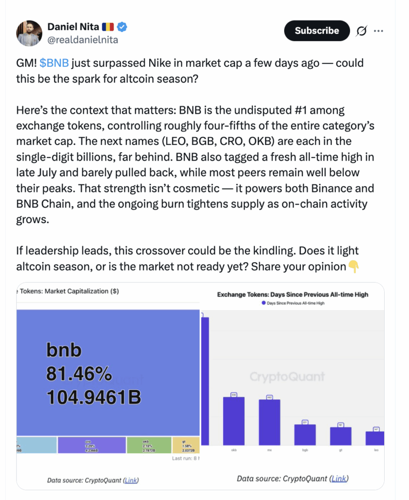 本周BNB市值正式超越耐克(1040亿美元),这不仅标志着其称霸交易所代币赛道,更意味着正式跻身全球顶级可交易资产阵营。