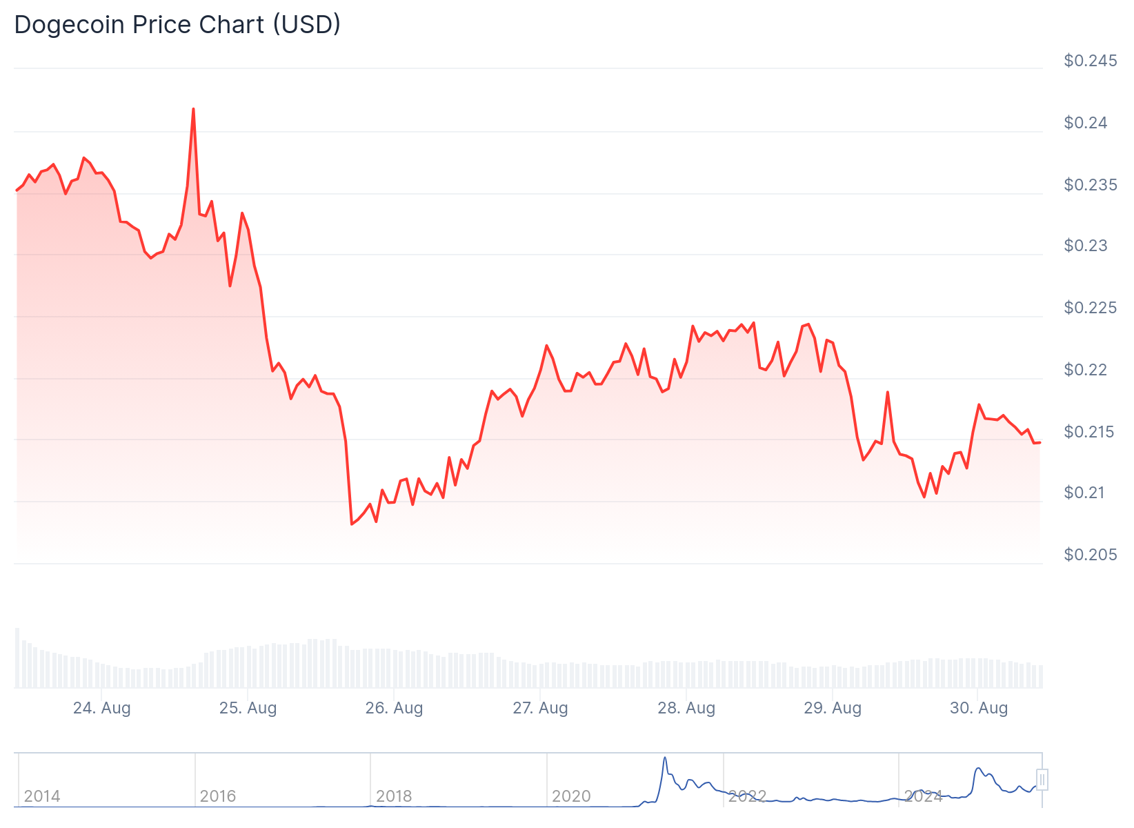 • 尽管传出2亿美元储备金计划,狗狗币仍下跌2%至0.21美元