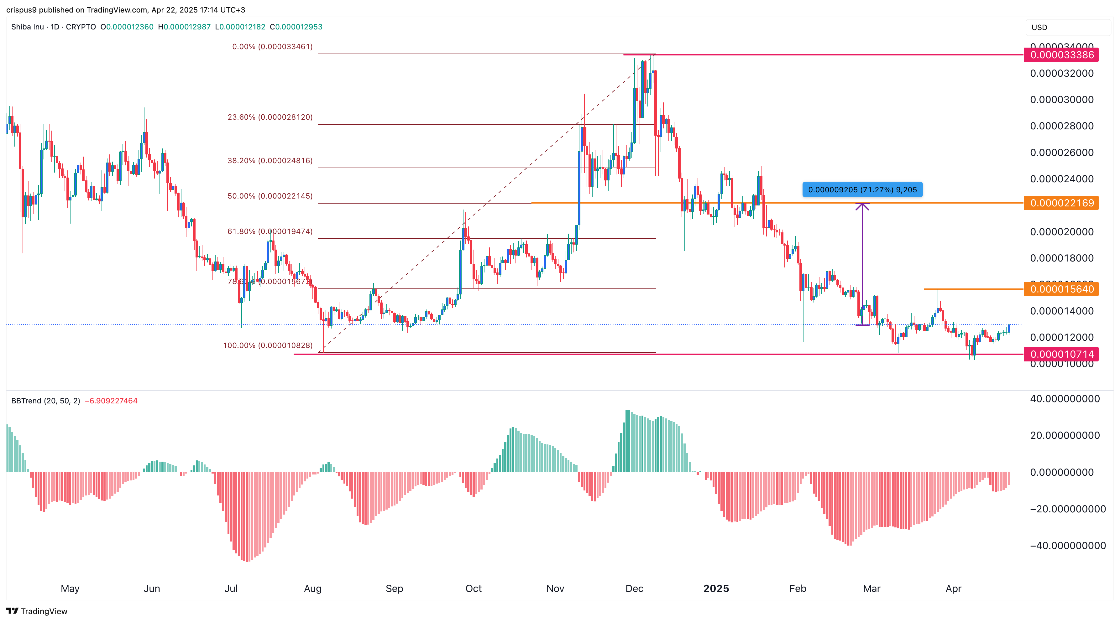 布林带趋势指标持续上升,并形成了看涨背离形态。该指标即将自去年12月以来首次突破零线。因此,初步目标价位为0.00001576美元,较当前水平上涨21%。若突破该水平,50%斐波那契回撤位0.00002217美元将成为下一个目标,该目标价较当前点位高出约70%。