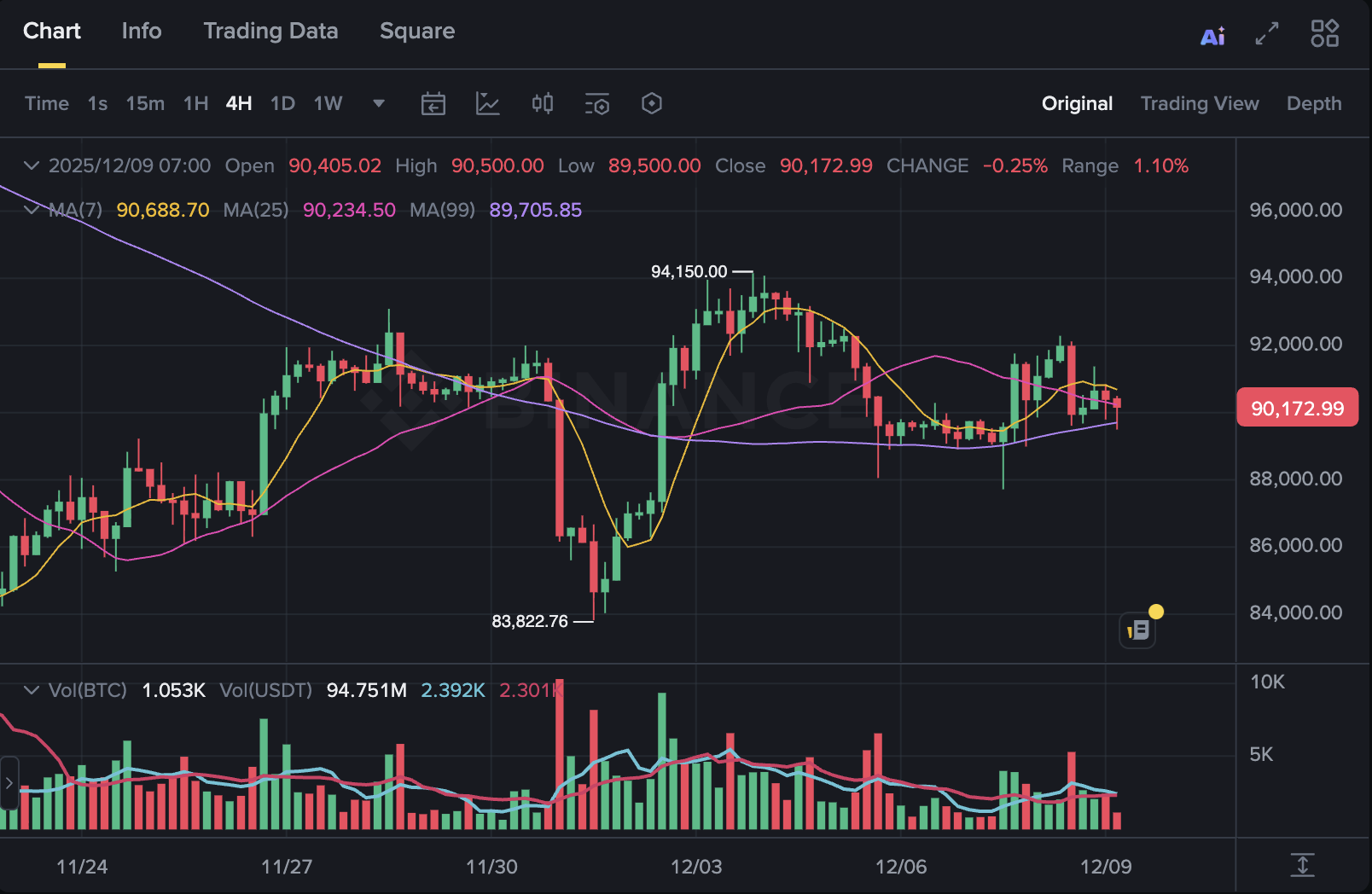 当前市场正呈现相似走势。比特币较10月126,000美元的峰值已下跌28%,逐步逼近83,000美元的ETF成本带。自12月初以来,ETF持续出现净流出。过去24小时内价格下跌1.3%,目前稳定在90,000美元附近。相较于12月2日测试的84,600美元低点,已实现显著回升。