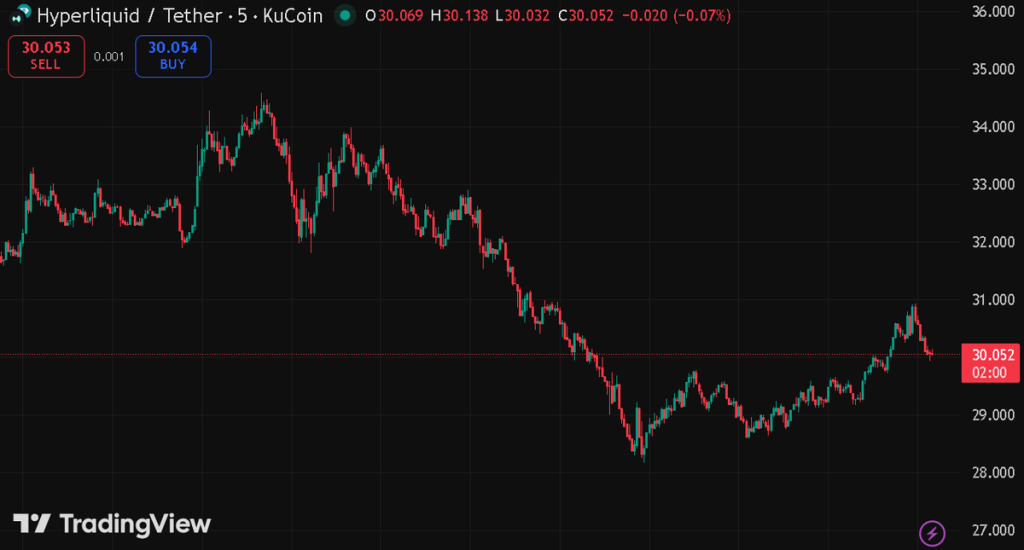 Hyperliquid(HYPE)目前交易价格为32.37美元,过去24小时内小幅上涨。该代币在过去一周涨幅接近42%。价格触及34美元后回落至28美元,随后反弹至当前水位。