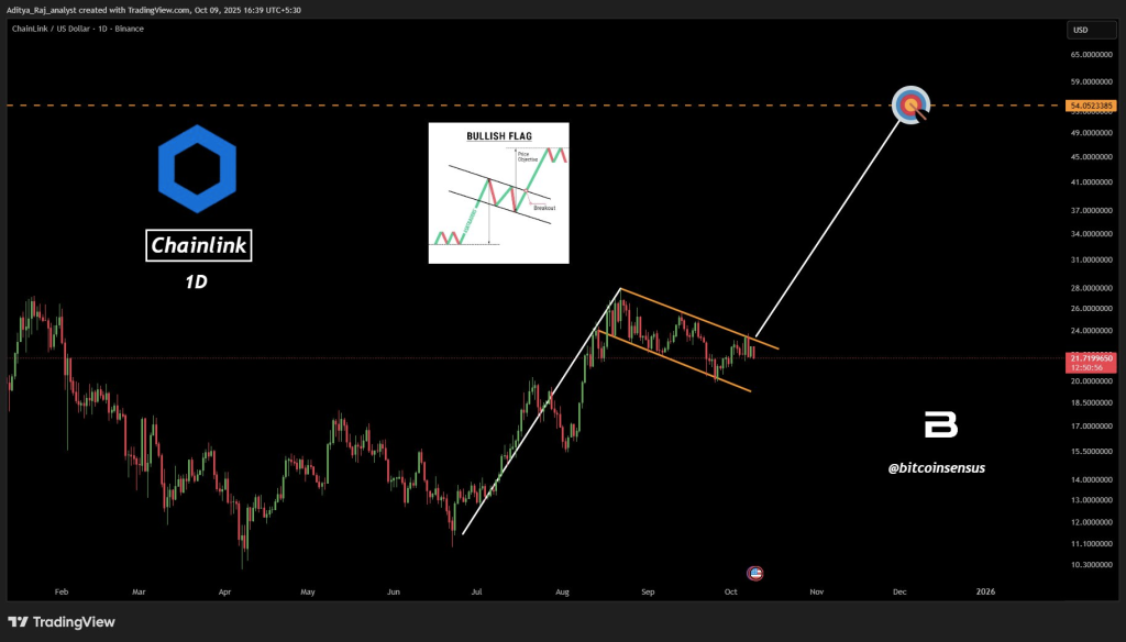 看涨旗形往往出现在价格急剧上升后的盘整阶段。就$LINK而言,该形态由两条平行下降趋势线构成矩形结构。当价格突破上轨趋势线时,通常被视为继续上涨的信号。分析师指出,若遵循技术形态规律,$LINK可能在突破阻力位后引发买盘压力,推动价格接近54美元目标位。