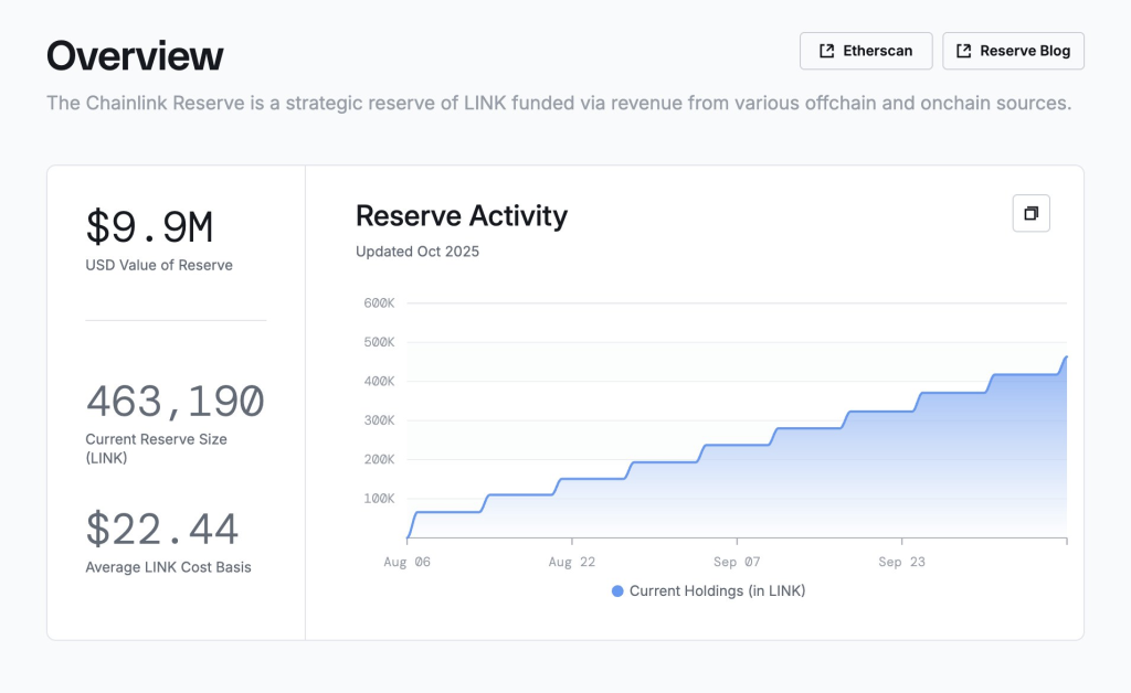 除技术形态外,Chainlink储备金近期显著增长,截至统计时共持有463,190枚$LINK(约合990万美元),最新单笔流入45,729枚$LINK。这是该储备金第十次接收代币注入,资金来源包括链下企业合作与链上服务使用费,这种机制将持续支持项目长期发展。