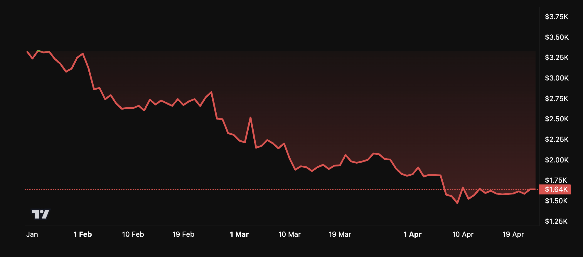 尽管如此,BeInCrypto的数据显示,在过去14天里ETH略有回升,上涨了6.1%。仅在过去一天,它就实现了1.7%的温和涨幅。截至发稿时,ETH的交易价格为1,639美元。