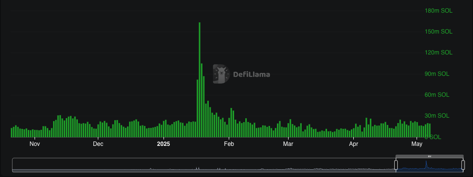 2025年1月的DEX交易量达到4080亿美元,占全年总量的一半以上。这一增长主要得益于2024年11月启动并在2025年1月达到顶峰的加密货币市场反弹。在此期间,Solana的价格上涨也推动了以美元计价的DEX指标上升。到3月份,这些数字已回落至反弹前的水平。以SOL计价,交易量在1月20日前后出现显著飙升,随后也回归到之前的水平。