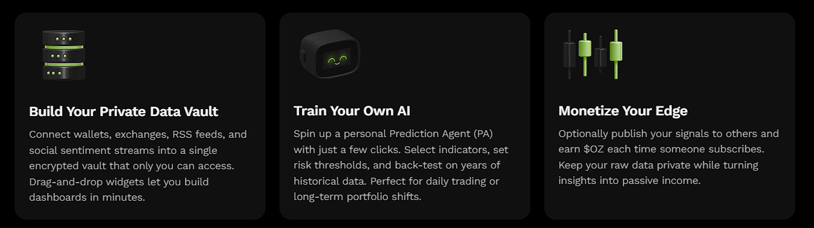 Ozak AI 正处于人工智能与区块链两大趋势的交汇点。其生态系统围绕AI预测代理构建——这些智能系统能实时分析市场数据、情绪和链上动向,生成交易洞察与趋势预测。这些模型旨在帮助交易者在剧烈波动的加密市场中做出更快、更智能的数据驱动型决策。