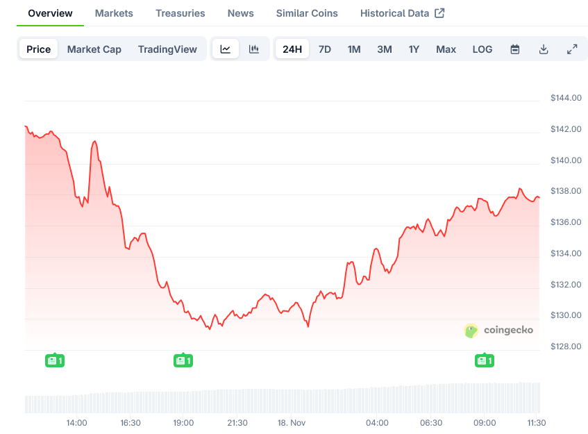 尽管ETF资金流入强劲,但Solana的价格仍在下滑。该代币过去一周下跌20%,24小时内下跌9%,随后小幅反弹。